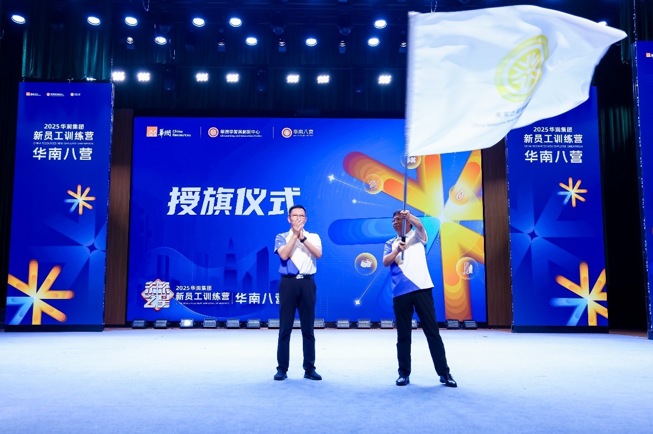 随后,华润医药党委副书记刘长安将象征使命传承、承载着医药报国使命的营旗授予华南八营营长黄先锋。黄先锋营长挥舞营旗,标志着华南八营正式启航。营员们以震撼的有氧鼓表演展现青春力量。医药板块多位领导一一寄语,并将象征祝福的吉祥物"耀闪闪"抛向营员,将现场气氛推向高潮。