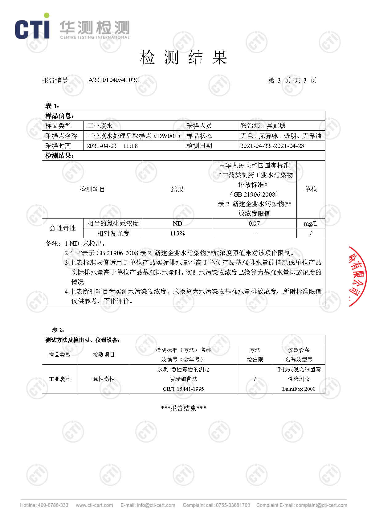色情小说 废水检测报告(2021年4月毒性)