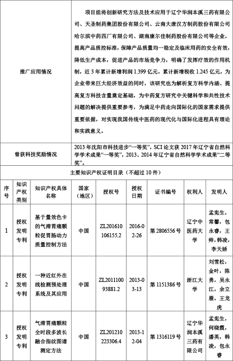 辽宁中医药大学拟推荐的教育部2018年度高等学校科学研究优秀成果奖(科学技术)项目公示