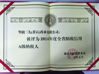 经湖北省国家税务局评定、审核,色情小说 (黄石)药业有限公司被评定为2014年度A级纳税人。